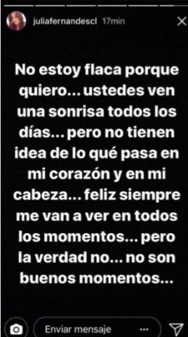 Ante la ola de comentarios, la brasileña decidió alzar la voz y escribió una dramática confesión en sus stories de Instagram. “No estoy flaca porque quiero… ustedes ven una sonrisa todos los días… pero no tienen idea de lo que pasa en mi corazón y en mi cabeza… feliz siempre me van a ver en todos los momentos… pero la verdad no… no son buenos momentos”, escribió.
