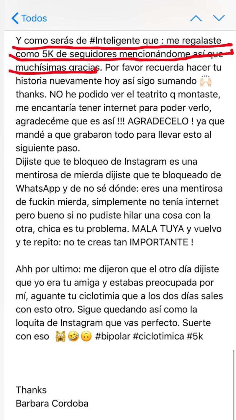 Fue la ex de Leandro Penna quien publicó en su cuenta de Instagram capturas de un correo que le envió la modelo donde deja en claro que llegará hasta las últimas instancias con tal de salvaguardar su honra.