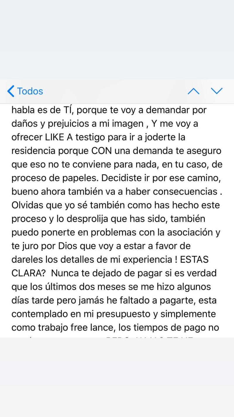 “…habla de ti, porque te voy a demandar por daños y perjuicios a mi imagen. Y me voy a ofrecer de testigo para ir a joderte la residencia porque con una demanda te aseguro que eso no te conviene para nada, en tu caso de proceso de papeles”, son parte de las palabras de ‘Barbie’.