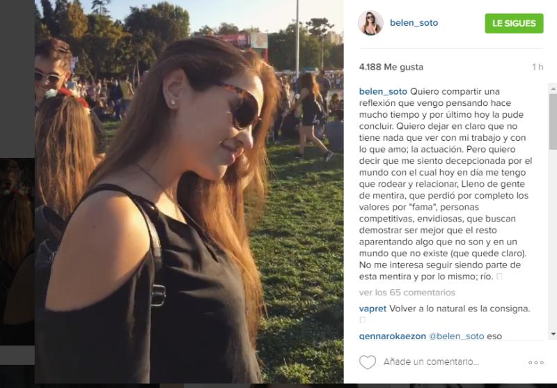 Aunque disfrutó mucho del festival, Lollapalooza hizo que Belén Soto hiciera una dura reflexión sobre el mundo que la rodea, ya que al parecer dentro de los mismos eventos de marcas que se viven dentro del evento, algo o alguien le molestó.