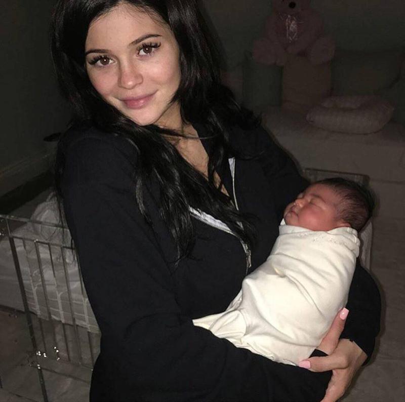 Kylie aparece esbozando una sonrisa mientras tiene a Stormi en brazos y su cara luce sin una sola gota de maquillaje. Eso sí sus ojos tienen máscara de pestañas.