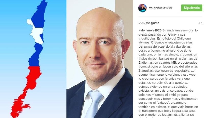 Valenzuela agregó que en el país “creemos y respetamos a las personas de acuerdo al valor de las cosas que tienen, no al valor que tiene cada uno, en lo más simple, creemos en títulos rimbombantes en si habla más de 2 idiomas, en cuantos MB, o doctorados tiene, si tiene un buen auto del año o las 3 argollas, ese weon es respetable”.