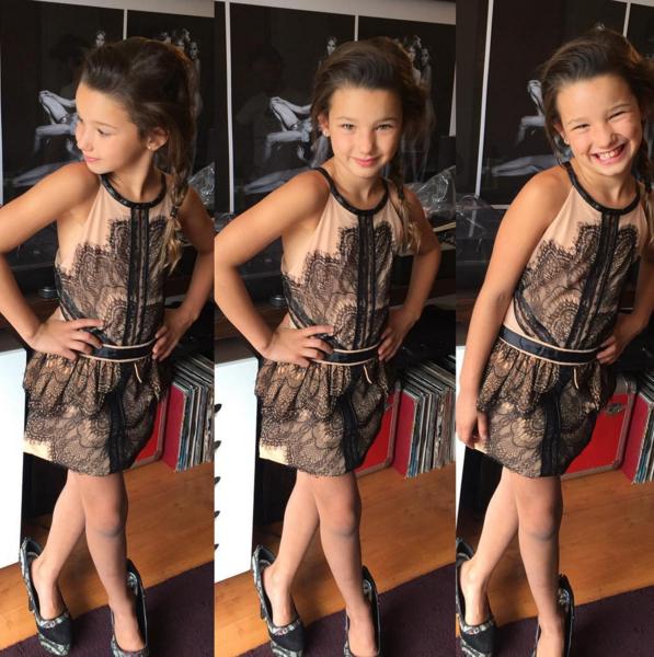 “@juanfailer PETIT ja,ja,ja…muy atrevida”, escribió junto a un collage de Sofía usando un vestido en tonos rosados y con encajes negros, y arriba de los zapatos con taco de su mamá.