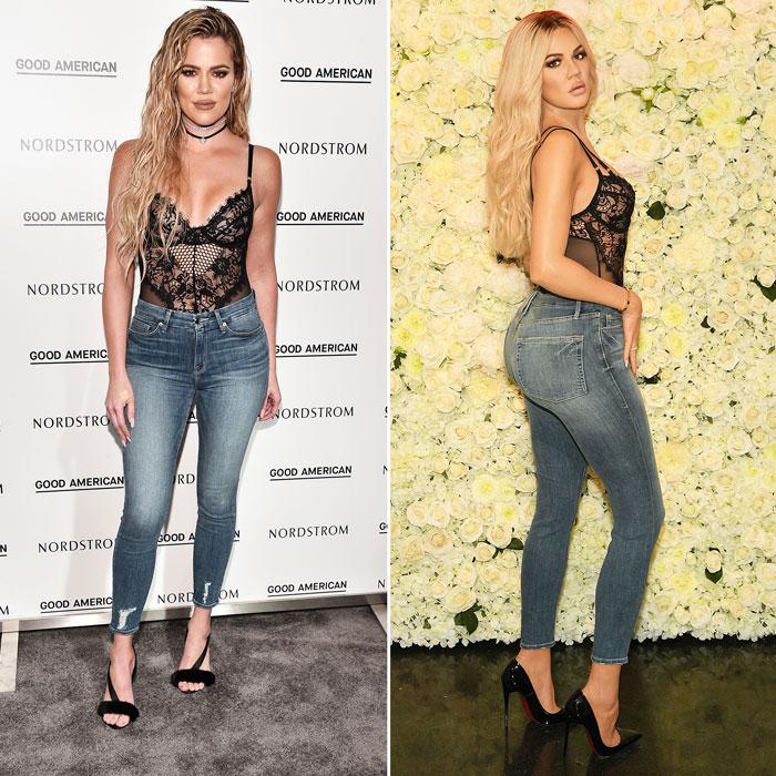 La rubia del clan Kardashian aparece con sus icónicos jeans americanos, pertenecientes a su empresa textil, unos tacones Christian Louboutin característicos por su suela roja, y un body de encaje negro.