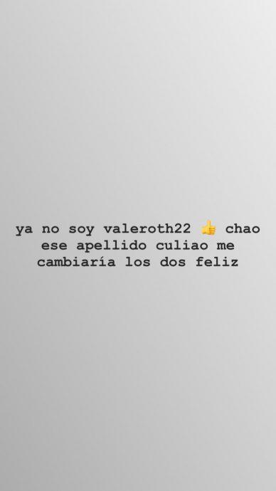 “Como se habrán dado cuenta ahora soy @valerulona en mi cuenta de Instagram. Me saqué el Roth Soracco porque estoy chata, no quiero tener nada de ellos (…) bien saben que no me llevo con nadie de mi familia”, continuó.