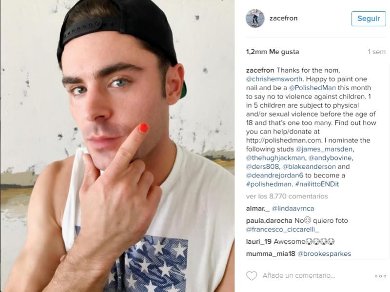En la imagen que subió Zac Efron a su cuenta de Instagram escribió "Gracias @chrishemsworth por nominarme. Estoy feliz de pintarme una uña" después agregó que "1 de cada 5 niños son víctimas de violencia física o sexual antes de que cumplan 18 años. Esto es demasiado. Esto no debería ocurrirle a ningún niño y todos nosotros tenemos el poder de cambiarlo".