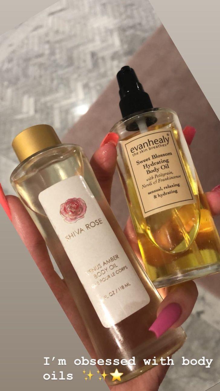 Jenner contó que sus favoritos son el aceite orgánico "Noni glow" de Kora y el aceite de jojoba de Kate Blanc, el que utiliza todas las noches antes de dormir en su rostro. Para el resto del cuerpo, opta por las marcas Shiva Rose y Evanhealy.