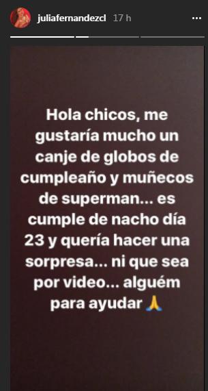 Julia pidió un canjé de globos y decoración de Súperman para este fin. En Instagram Stories pide la ayuda de empresas que se dediquen a hacer cumpleaños.
