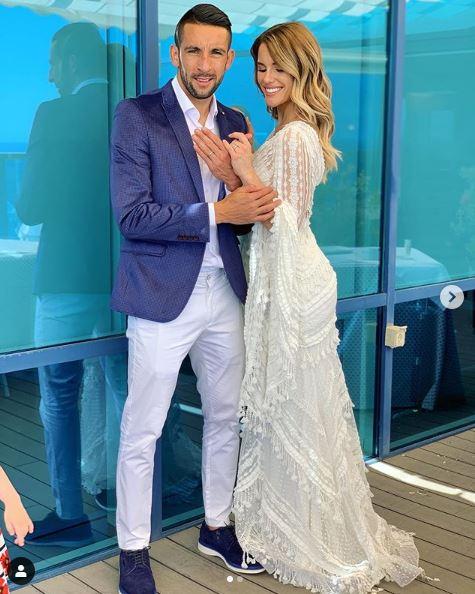 Gala Caldirola se casó con el "Huaso" en una fiesta que se llevó a cabo en España, en la ciudad costera de Benidorm razón por la cual escogió un vestido acorde.
