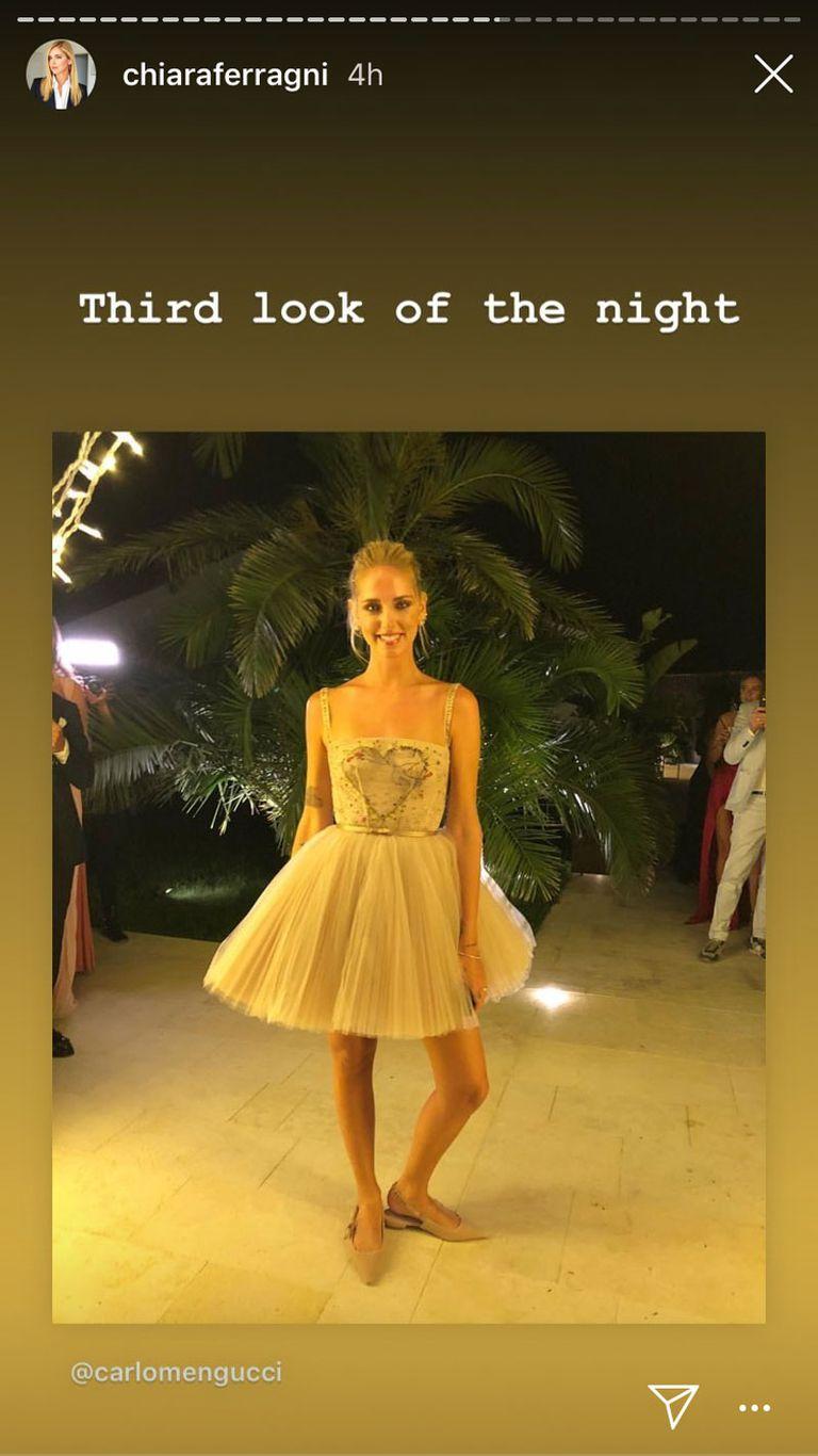 LUego Chiara se puso un vestido rosado con dibujos, también hecho por Dior. y Este también tenía varias sorpresas preparadas, porque la falda también era intercambiable, y más entrada la noche la blogger la cambió por una más corta estilo tutu.