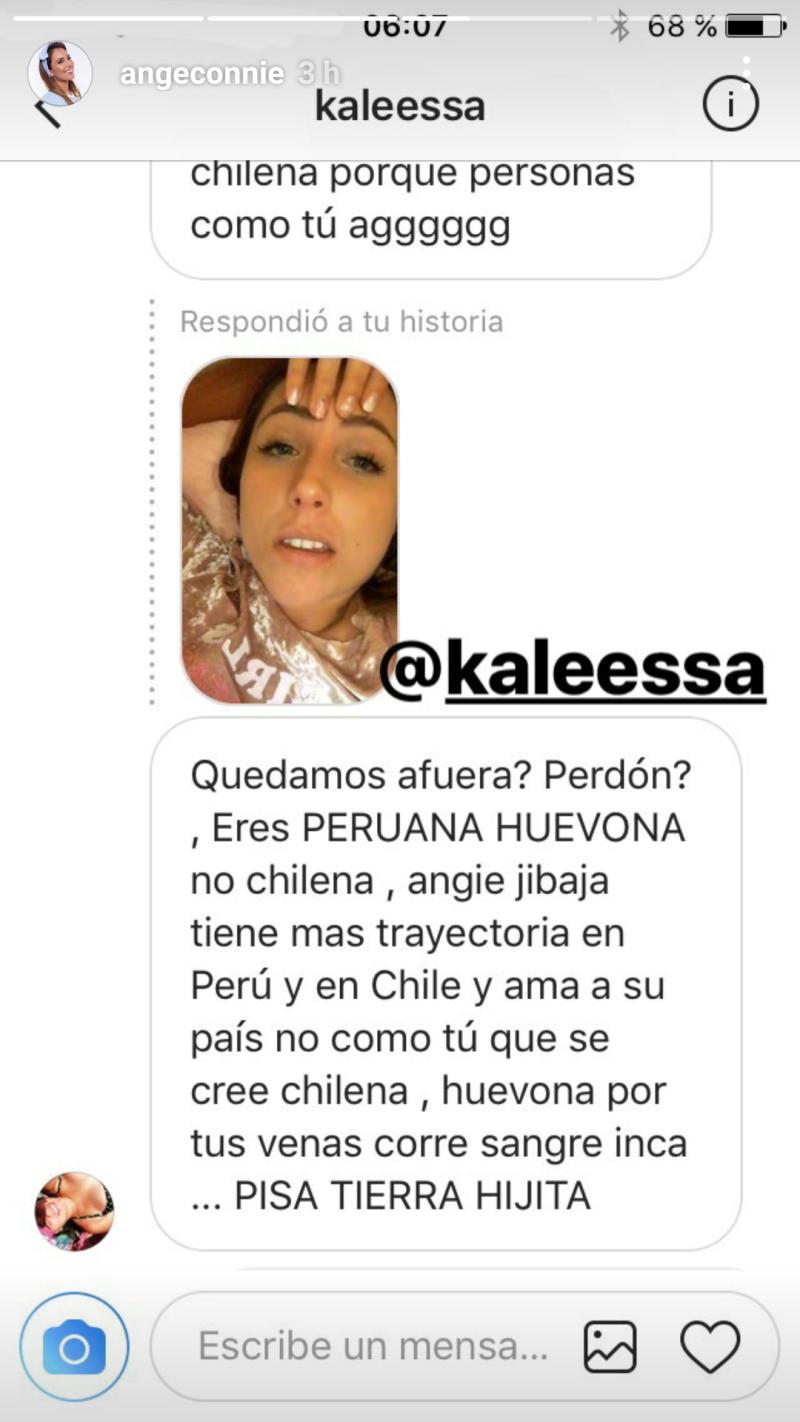 La situación no pasó desapercibida por Ángela y respondió con un extenso mensaje: “Mi familia es peruana y yo soy chilena. Nací en Chile y siempre he vivido aquí… Amo donde nací y también a Perú por qué es el lugar donde nació mi abuela quién es como mi madre… Me parece increíble que saques temas tan básicos y sin sentido… Me dio vergüenza leerte… Una lástima que seas TÚ peruana y hables así… Las peruanas suelen tener buenos modales y son educadas, además de hablar muy bien el español. Una pena que seas algo distinto a eso pero eso no quitará mi amor por ese bello país”