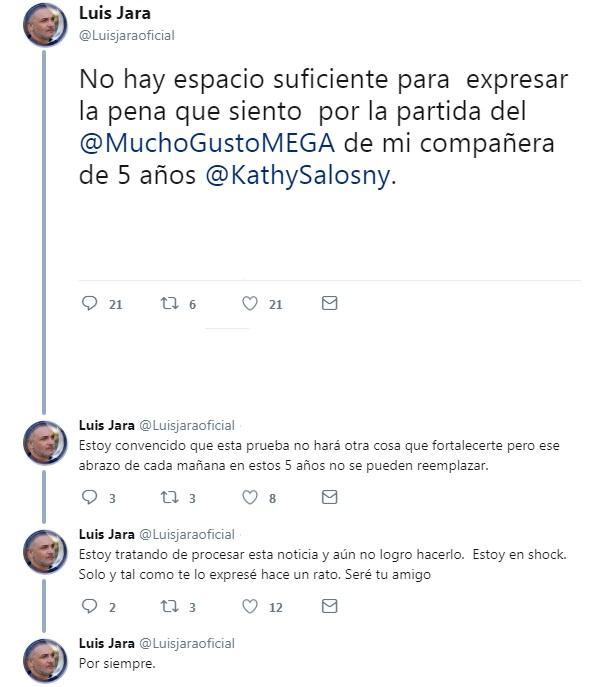 Han sido compañeros de trabajo desde hace cinco años, pero eso ya no va más. Katherine Salosny dejará de ser parte del espacio matinal “Mucho Gusto”, lo cual impactó de sobremanera a Luis Jara, quien expresó sus sensaciones en Twitter.