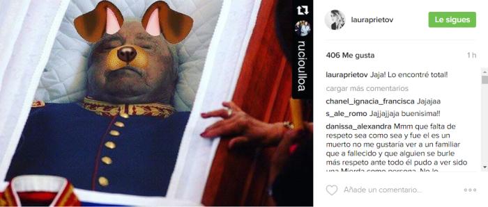 Lo encontró chistoso, “total” y lo compartió. Pero lo que nunca Laurita pensó es que su foto en Instagram sensibilizaría tanto a sus fieles. La ola de comentarios divididos se acumuló en cosa de minutos y ante las críticas Prieto decidió borrar su “meme” de Augusto Pinochet en el féretro y con las orejas y nariz del perro de Snapchat.