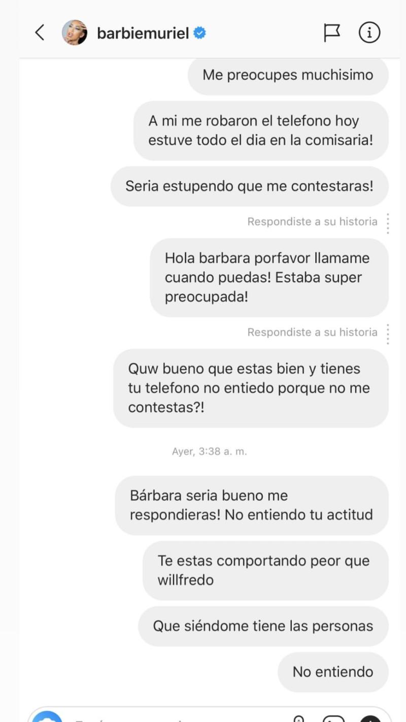 “Barbie no está desaparecida, aparentemente está en Mendoza, la está pasando súper bien. Ella está viviendo hace algunos meses en mi departamento en Miami y hace una semana que su teléfono aparece bloqueado para mí, al igual que su Instagram (…) Estaba súper preocupada, pensé que te pasaba algo, pero parece que está desaparecida solo para mí. No te escondas por favor, al menos dime ‘mira, no te voy a pagar la renta’, y me busco otra roommate, pero esto me parece terrible, porque tienes tus cosas en mi casa y qué feo”, fueron parte de sus palabras.
