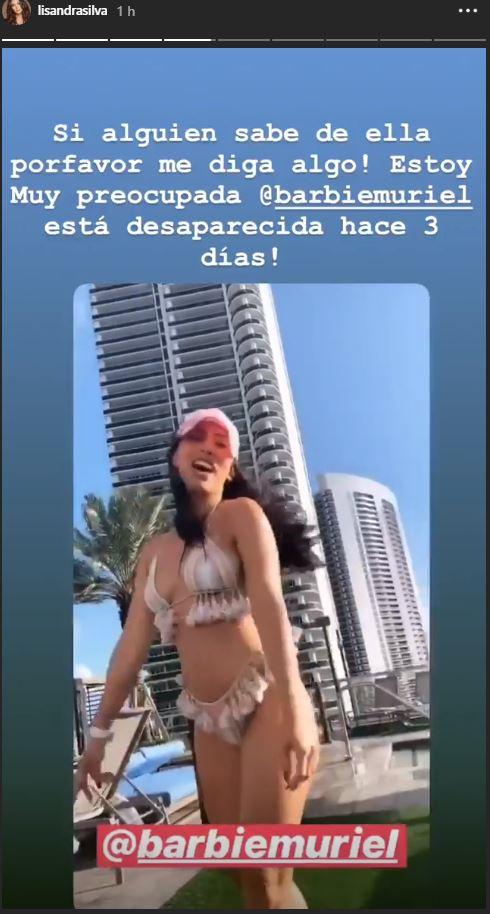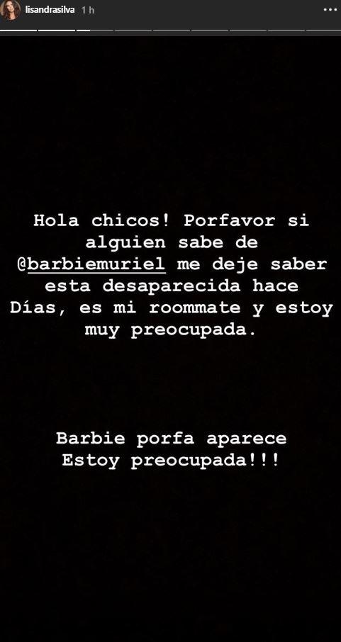 "Hola chicos por favor si alguien sabe de @barbiemuriel me deje saber. Está desaparecida hace días, es mi roommate y estoy muy preocupada. Barbie por favor aparece, estoy preocupada", escribió la cubana a través de sus stories de Instagram.