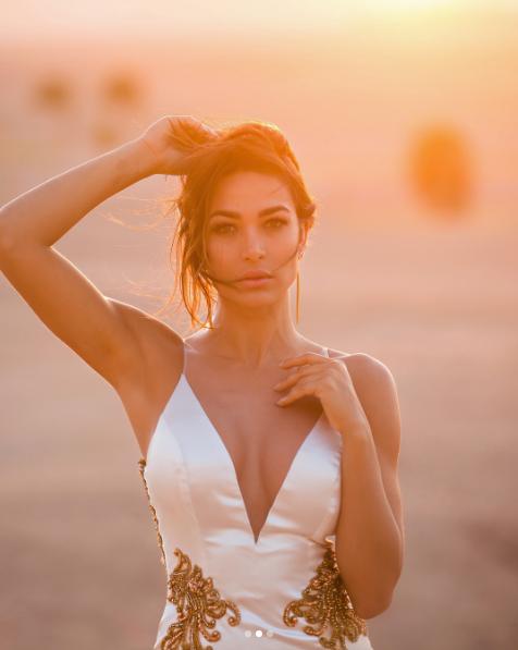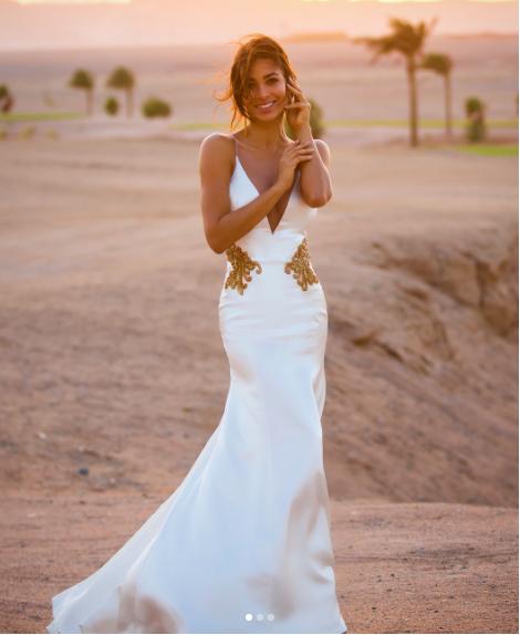 Para cerrar su última noche en Egipto, Lisandra Silva optó por un vestido blanco reluciente, con detalles bordados en dorado en la cintura y espalda.