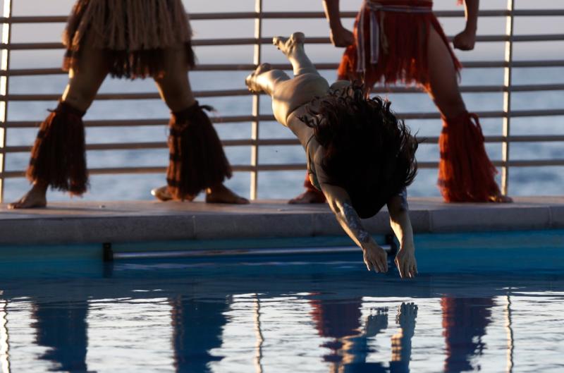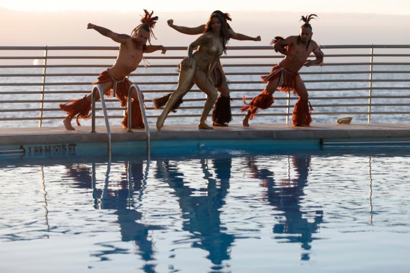 La modelo cubana que representaba a Chilevisión eligió un look inspirado en una diosa tahitiana con un baile previo que terminó con el esperado piscinazo.
