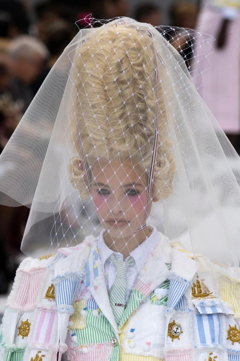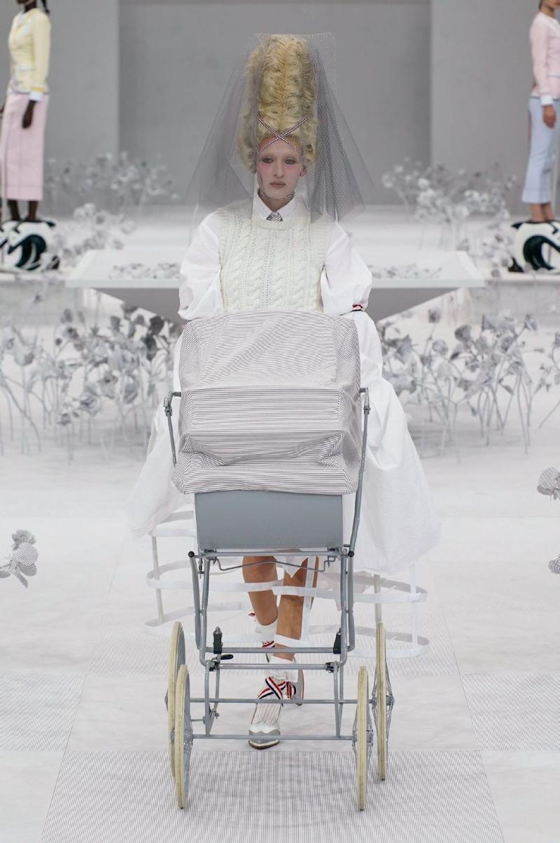 2- Velo y mundo bebé: el diseñador de moda estadounidense Thom Browne hizo un guiño al mundo bebé integrando coches en su pasarela, colores pastel y velos con peluca de juez.