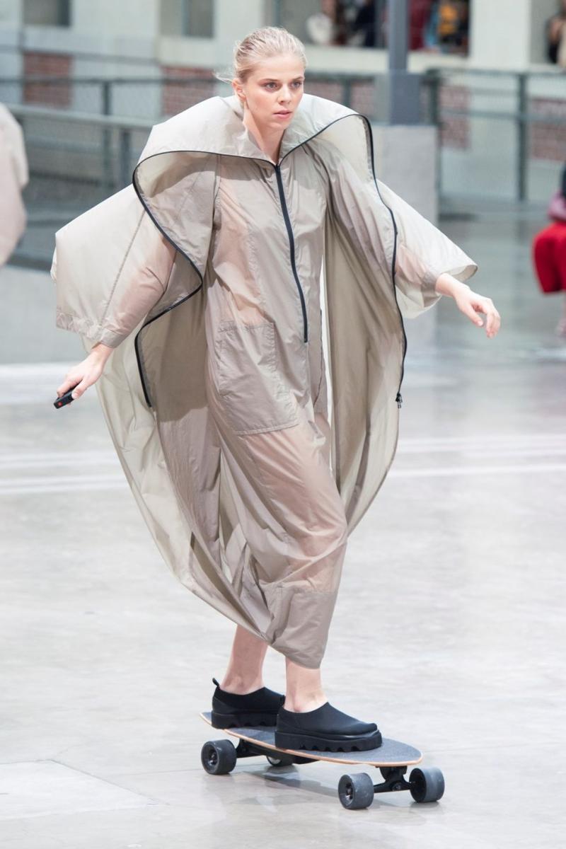 5- Desfile en monopatín: De esta forma y con formas futuristas se presentó la pasarela de Issey Miyake.
