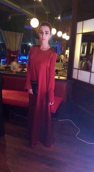 La actriz casi siempre escoge Tommy Hilfiger, este atuendo, de seda, inspirado en la tendencia de la camisa de dormir. Puede gustar, como no. No hay intermedios con esta moda... Creemos que a ella le queda bien.
