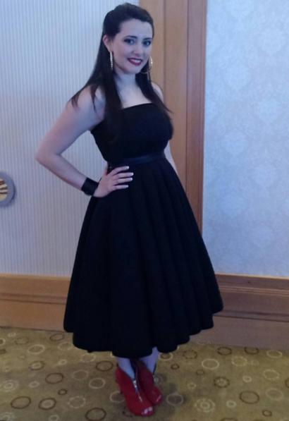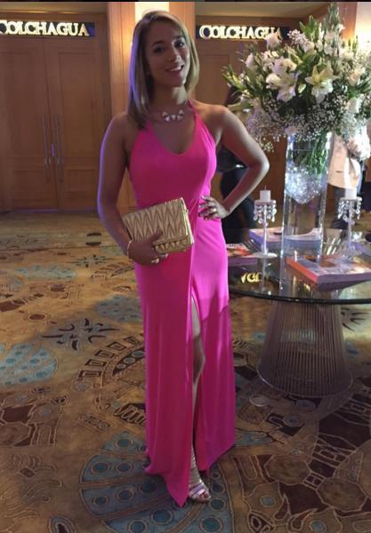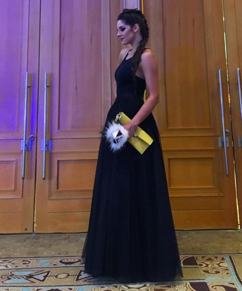 Estilo gótico. Kel usó un body cuya falda fue diseñada por la nacional Lupe Gajardo. Su clutch amarillo con el pompom fendi levantaron su look.