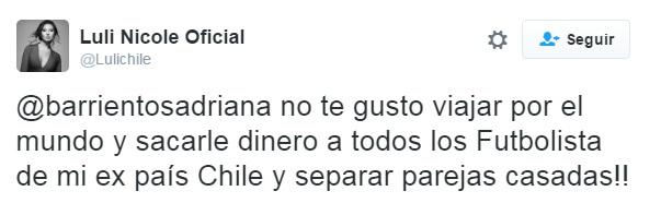 “Adriana Barrientos, no te gustó viajar por el mundo y sacarle dinero a todos los futbolistas de mi ex país Chile y separar parejas casadas”, escribió Nicole sobre su eterna rival televisiva en Twitter.