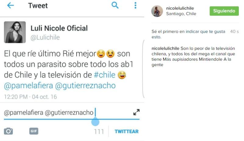 “Son lo peor de la televisión chilena y todos los del Mega, el canal que tiene más auspiciadores, mintiéndole a la gente”, publicó la joven también en Instagram, donde subió una foto de uno de sus tuits.