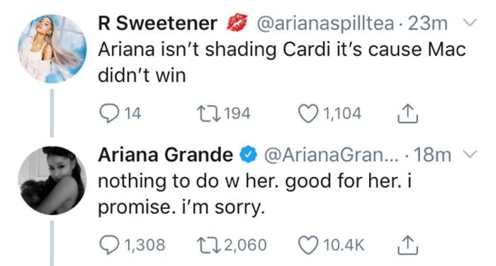 Dado que muchos asumieron que eran para Cardi B, la artista aclaró que no tenía nada en contra de ella."Nada que ver con ella. Bien por ella. Lo prometo, lo siento", explicó.