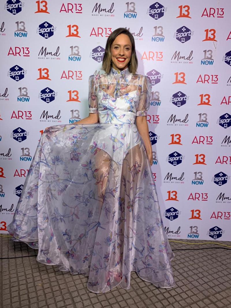 La comunicadora resalta entre los asistentes con una elegante y atrevida apuesta compuesta por un ceñido body blanco y encima un vestido traslúcido que deja ver su figura a un año de convertirse en madre.
