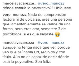 Uno de los comentarios hizo reaccionar a la rubia, pues una usuaria la criticó por tener un trato "peyorativo". La descripción de Marcela dice: "Con la Antonia disfrutando del hermoso Lago Villarrica" y el comentario que la molestó señala: "Seguro es tu nana, pues la nombras peyorativamente".