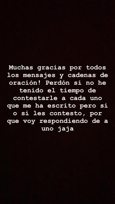 “Muchas gracias por todos los mensajes y cadenas de oración. Perdón si no he tenido el tiempo de contestarle a cada uno que me ha escrito pero sí o sí les contesto, porque voy respondiendo de a uno”, redactó en una de sus stories en su cuenta de Instagram.