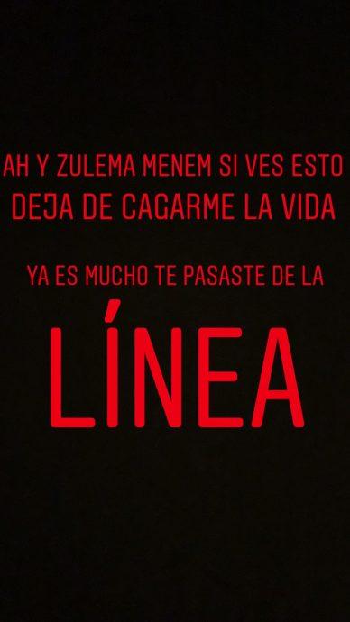 “Ah y Zulema Menem, si ves esto, deja de cagarme la vida. Ya es mucho, te pasaste de la línea”, redactó.