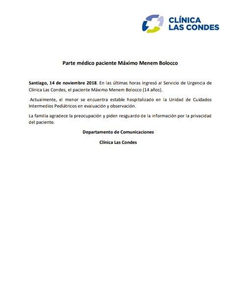 La Clínica emitió un comunicado oficial con el estado de salud del joven, sin dar aún detalles del diagnóstico.
