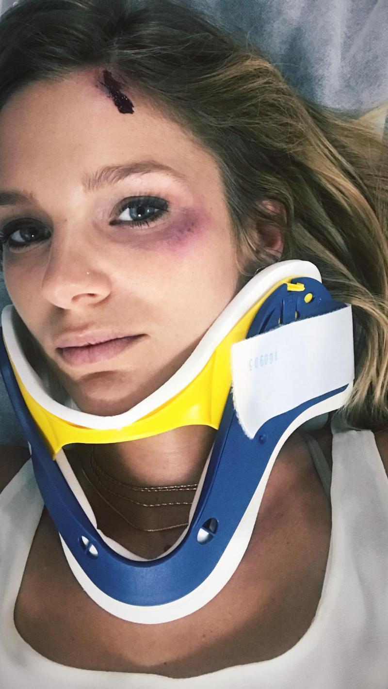 La actriz aparece con un cuello ortopédico y con un moretón en uno de sus ojos.