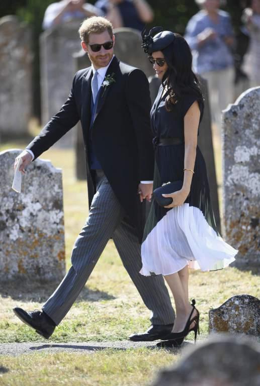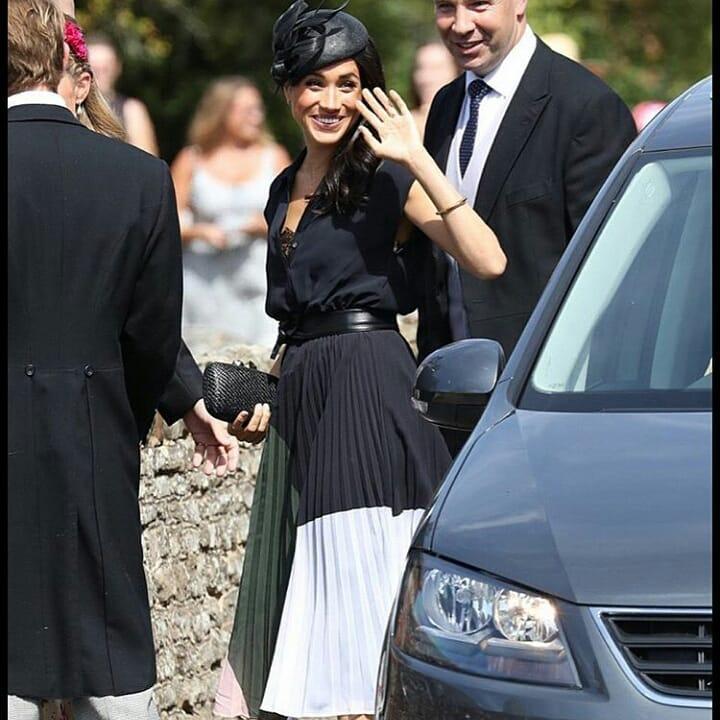 La hoy Duquesa de Sussex deslumbró en su cumpleaños número 37, precisamente durante su asistencia a la boda del mejor amigo del príncipe Harry, Charlie van Straubenzee. La ex actriz llegó al lugar con una blusa azul marino y una falda plisada en cuatro colores junto al ya tradicional fascinator y de inmediato llamó la atención.