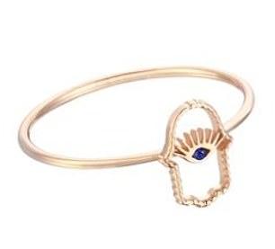 En sí, el anillo destaca por la hamsa o más conocida como “mano de Fátima” que tiene al medio, compuesta de una mano abierta con un ojo incrustado en la palma, que en este caso es de zafiro.