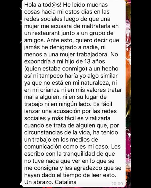 “Jamás he denigrado a nadie, ni menos a una mujer trabajadora. No expondría a mi hijo de 13 años (quien estaba conmigo) a un hecho así ni tampoco haría yo algo similar ya que no está en mi naturaleza”.