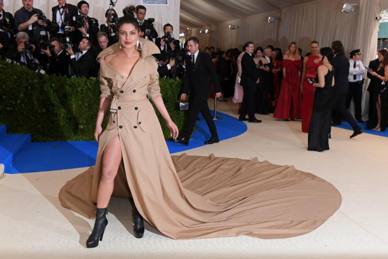 Priyanka Chopra luce un trench coat Ralph Lauren intervenido para el fin de una gala. El botín urbano también se hizo presente.