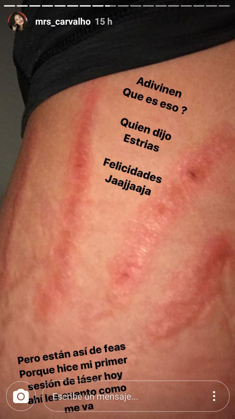 “Adivinen, ¿Qué es eso? ¿Quién dijo estrías? ¡¡Felicidades!!”, “Pero están así de feas porque hice mi primer sesión de láser hoy, ahí les cuento como me va”, escribió la brasileña en una de las publicaciones.