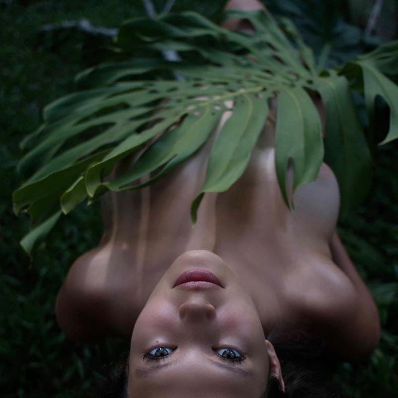 Carvalho posa al desnudo cubriendo su figura con hojas enormes mientras permanece recostada en los árboles de la isla.