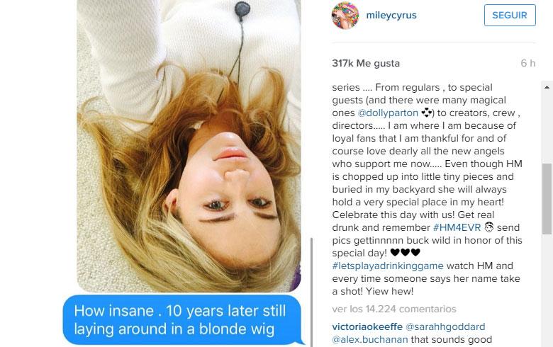 "Celebren este día con nosotros! Emborráchense y recuerden #HM4EVR (Hannah Montana por siempre) envíen fotos volviéndose locos en honor a este día especial. Juguemos un juego para beber, vean el show y cada vez que alguien diga “Hannah” tomen un trago. Yahooo!", concluyó Cyrus.