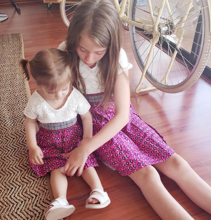 A ambas les puso un vestido con tejido en la parte superior y una falda holgada fucsia con el que las niñas se lucieron en un hermoso retrato.