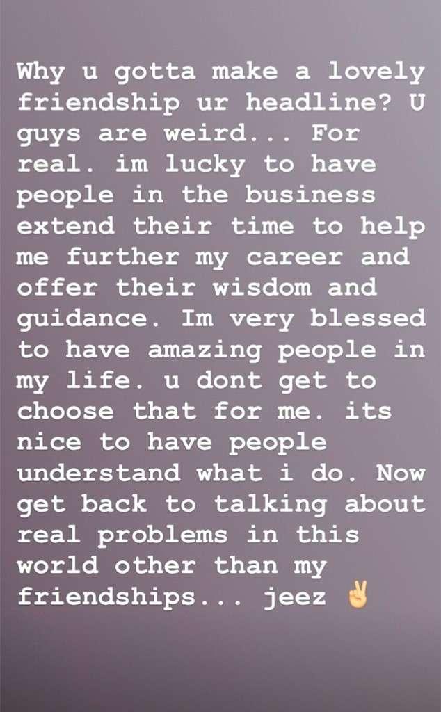 "¿Por qué una bonita amistad tiene que convertirse en titular de noticias? Ustedes son muy raros... De verdad. Tengo suerte de que la gente de esta industria me dé su tiempo para ayudarme a avanzar en mi carrera y ofrecer su sabiduría y guía. Tengo la gran fortuna de tener personas increíbles en mi vida. Ustedes no pueden elegir eso por mí. Es bueno tener gente que entienda lo que hago. Ahora mejor volvamos a hablar de problemas reales en este mundo en lugar de mis amistades... Por Dios", escribió en su cuenta de Instagram.
