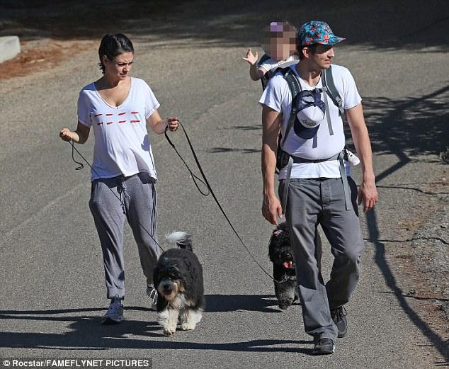 Mila Kunis, con un look sport y muy chic, sin maquillaje, panzoncita, con los perros, con Ahston y Wyatt, su hija de un año de edad… ¡Qué lindo suena todo eso!
