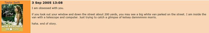“Estoy obsesionada contigo. Si miras hacia afuera, a unas 200 yardas, quizá veas una gran van blanca estacionada en la calle. Estoy adentro con un telescopio y un computador. Intentando obtener una mirada de la maldiiiiita Kelsey Morris. jaja. fin de la historia.”