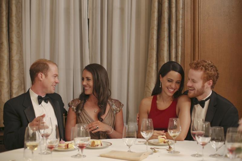 En esta foto podemos ver a los actores que interpretan al Príncipe William (Burgess Abernethy), Kate Middleton (Laura Mitchell), Meghan Markle (Parisa Fitz-Henley) y el Príncipe Harry (Murray Fraser).