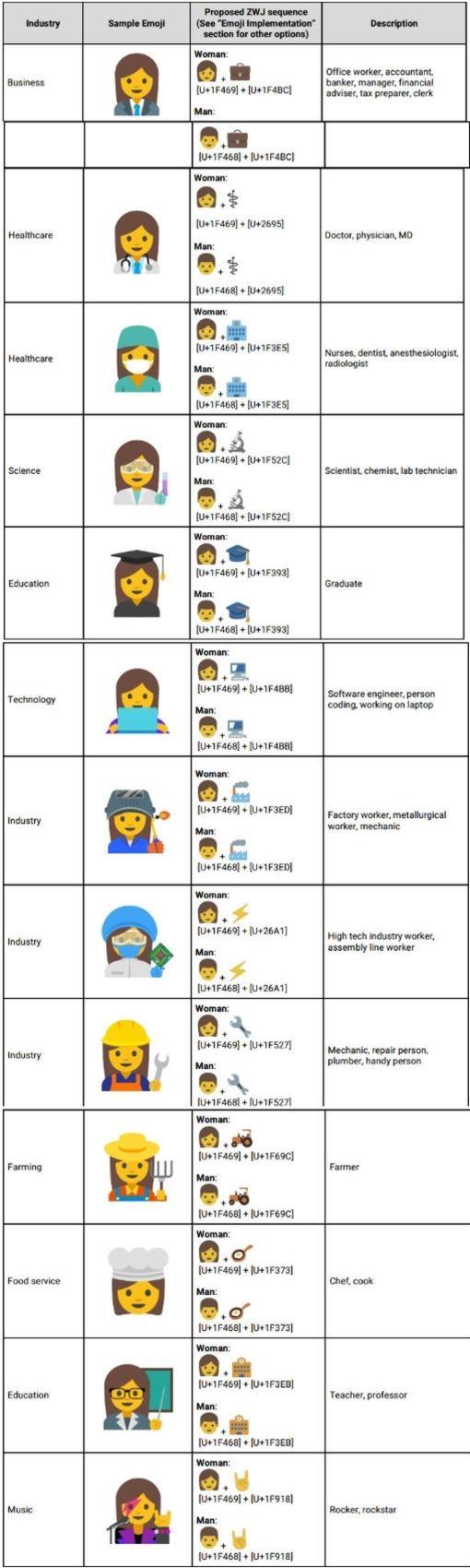 “Nuestra propuesta es crear un nuevo conjunto de emojis que represente a una amplia gama de profesiones para las mujeres y los hombres con el objetivo de destacar la diversidad de las carreras de las féminas y el empoderamiento de las niñas”, comentaron Rachel Been, Nicole Bleuel, Agustin Fonts y Mark Davis, desde el buscador más famoso del mundo.
