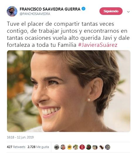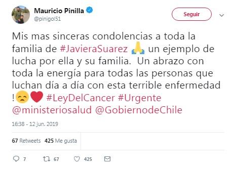 "Mis mas sinceras condolencias a toda la familia de #JavieraSuarez un ejemplo de lucha por ella y su familia. Un abrazo con toda la energía para todas las personas que luchan día a día con esta terrible enfermedad".