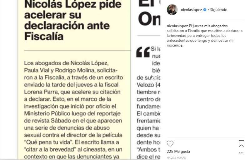 Nicolás López reapareció en redes sociales a casi cinco meses de que se dieran a conocer las denuncias de acoso y abuso sexual en su contra de la mano de un reportaje que realizó la revista Sábado de El Mercurio.