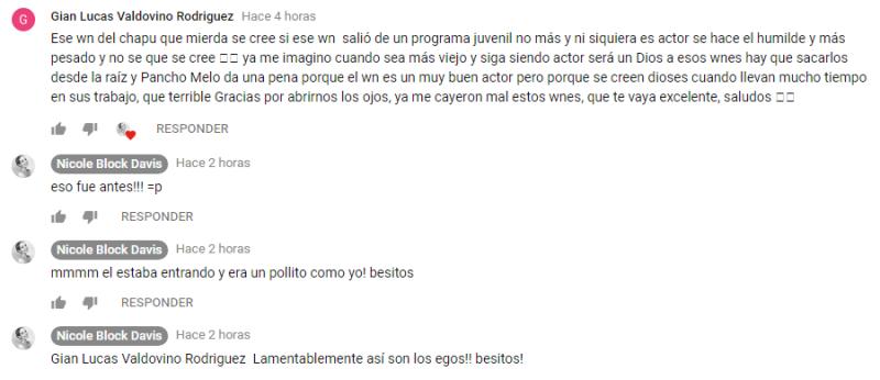 Además habló del trato que se le daba a los menores de edad, refiriéndose a las guaguas que tenían que “actuar” en la teleserie de la que ella era parte. “Una vez estaba en maquillaje y llaman a la maquilladora y le dicen que tenía que pintarle el pelo rojo a una guagüita. La guagüita ya era colorina y no tenía más de dos meses. Obviamente la maquilladora no quería hacerlo porque le podía dar una reacción alérgica y le podía hacer daño, pero tuvo que hacerlo igual” contó.